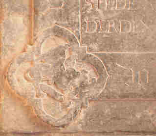 Op de 4 hoeken zien we "vierpassen", voorstellende de symbolen van de evangelisten Mattheus, Marcus, Lucas en Johannes. Rechtsonder een detail van een steen met het symbool van St. Marcus. (een leeuw met vleugels)